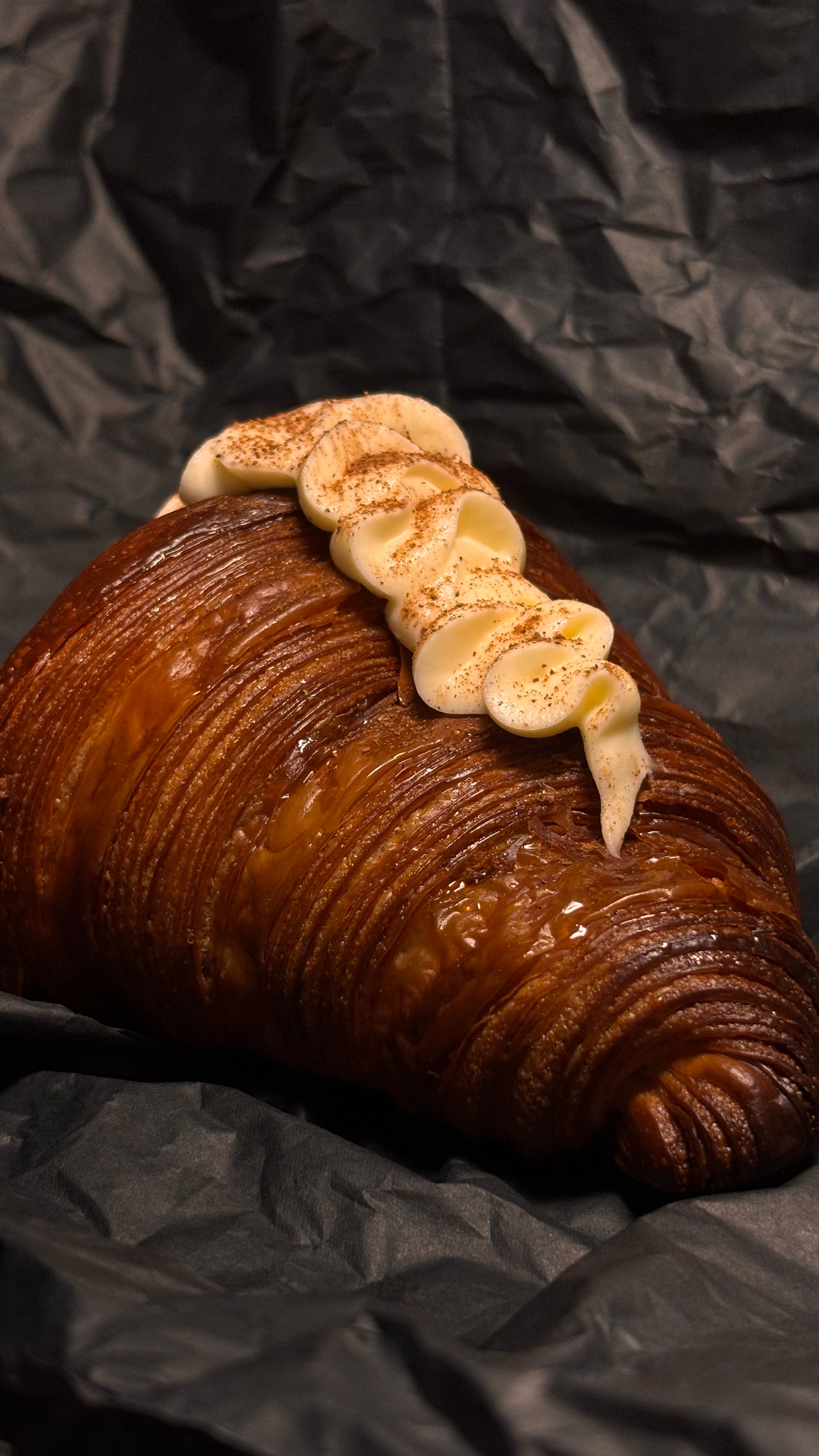 Apple croissant filled with caramelized apples infused with cinnamon, cardamom, and vanilla. Finished with a smooth mascarpone cream and a light dusting of cinnamon.