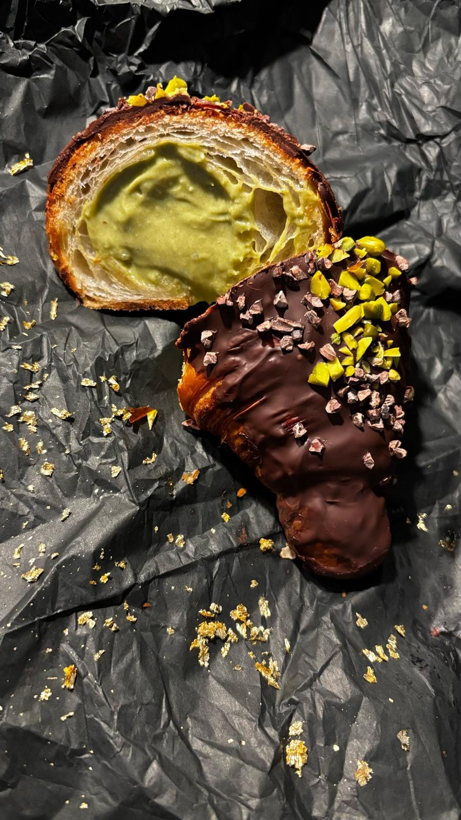 Croissant filled with 40 gr of pistachio and mascarpone cream, covered in O'Payo 70% chocolate, crushed pistachios, and cocoa nibs on top, decorated with kadayif and edible gold dust.