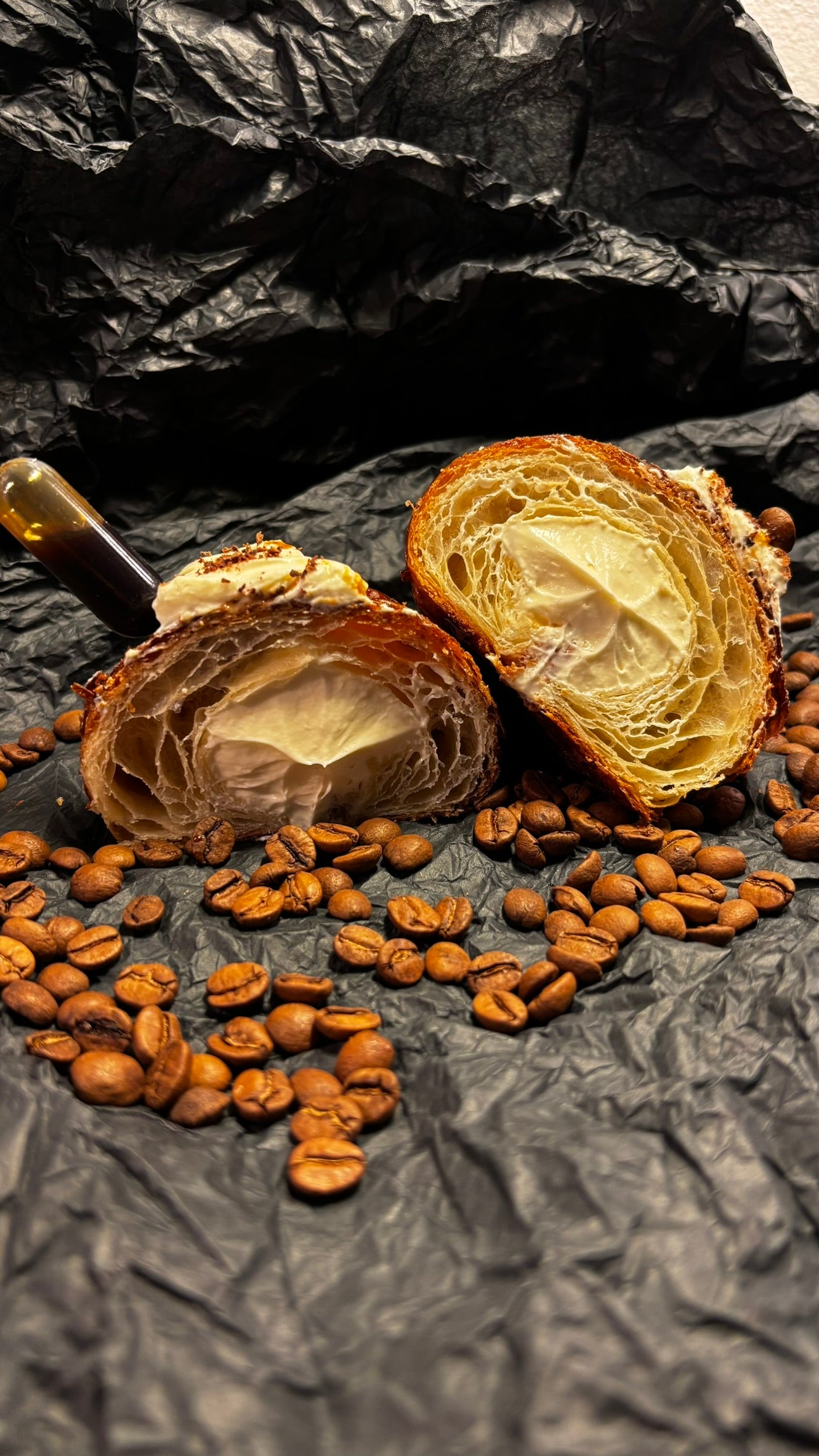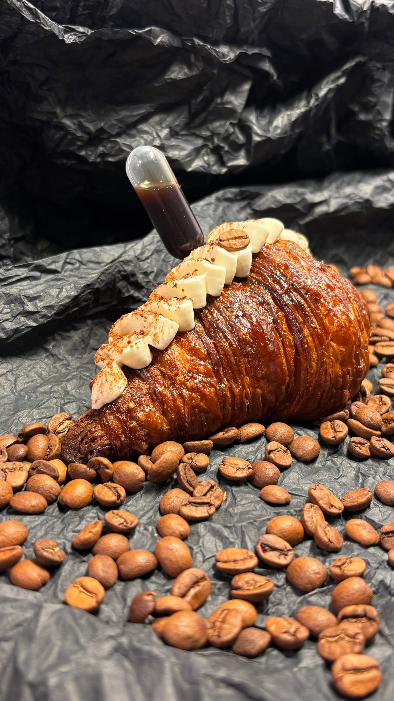 Croissant filled with mascarpone cream, cocoa powder on top, and decorated with coffee beans and a pipette of coffee reduction.